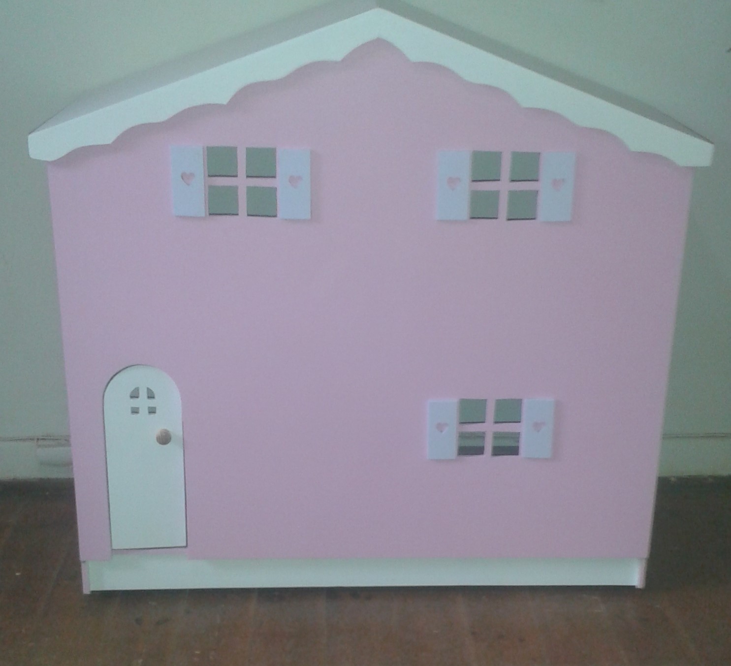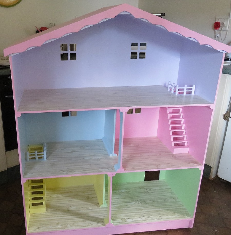All our barbie houses can be painted in any of our colours. the large house is 1,3 m high and the smaller house is 1 m high. They are all on castor wheels, furniture is only available with the house . All houses are the same as the first picture on the reverse side. We were also asked to make a single level house, I have included a picture here.