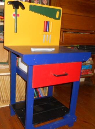 TRAIN, STOVE, WORKBENCH, PETROL PUMP AND BLACKBOARD Workbench, includes 6 wooden tools Petrol tanks, ideal for bike tracks Awesome double sided blackbaord Stove painted in primary colours Chunky train set Petrol garage